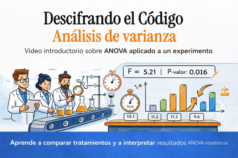Este video, titulado “Descifrando el Código”, te lleva de la mano a entender por qué el ANOVA (análisis de varianza) es como el “árbitro” de los experimentos cuando no tienes solo dos opciones, sino varios tratamientos y necesitas decidir, con evidencia, si realmente hay diferencias entre ellos. A través de un ejemplo visual tipo laboratorio —con mediciones comparables entre condiciones, como si estuviéramos cronometrando el desempeño de un proceso en una banda— el video aterriza la idea central: en un experimento, no basta con “se ve mejor”, hay que demostrar si la variación observada se explica por el tratamiento o si es puro ruido del sistema.